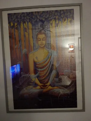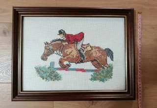 Precioso cuadro realizado a punto de cruz con la imagen de un jinete y su caballo saltando un obstáculo. - Marco de madera. - Diseño detallado del caballo y el jinete con vestimenta de equitación. - Colores vivos en el diseño.