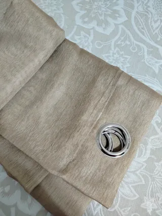 Cortina visillo con un diseño elegante y moderno. - 140cm de ancho x 269cm de largo. - Color beige oscuro. - Incluye ojales para colgarla fácilmente.