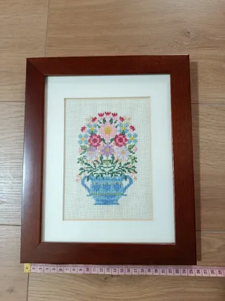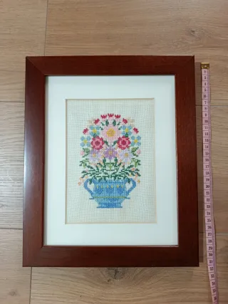 Precioso cuadro realizado a punto de cruz con un diseño floral. - Motivo central de flores en un jarrón azul. - Marco de madera oscura.