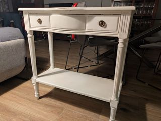 Mueble recibidor de estilo clásico con un cajón y una balda inferior. - Diseño elegante con patas torneadas. - Tirador metálico en el cajón. - Acabado en blanco.
