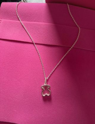 Original colgador de joyas con un diseño único. - Estructura de alambre plateado con perlas. - Figura de mujer con chaqueta rosa y pantalón vaquero.
