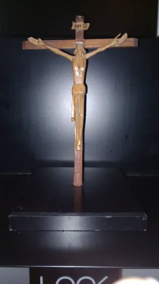 Precioso crucifijo de madera con cristo creo que es de olivo al menos la figura de Cristo. 23 x 16 cm mide la cruz - Figura de Cristo detallada. - Fabricado en madera, posiblemente de olivo. - Base de soporte incluida.