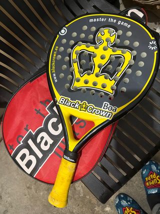 Raqueta de pádel Black Crown Boa con diseño llamativo. - Marco negro y amarillo. - Logo de corona amarilla en la cara. - Empuñadura amarilla. - Incluye funda roja con logo Black Crown.