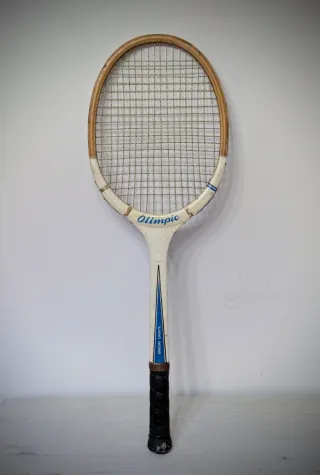 Raqueta de tenis vintage de madera con el nombre Olimpic. - Marco de madera. - Empuñadura negra.