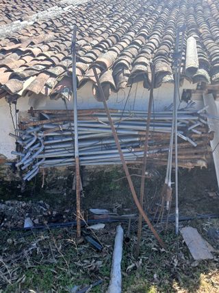Tubos metálicos para la construcción de invernaderos. Son resistentes y fáciles de manejar. - Material: Metal - Uso: Invernadero 15 euros el arco y 8 cada pata Son del material de huelva el bueno y resistente se vende por cese de actividad No se envía hay mucho más material del q aparece en la foto más algunos en la tierra puestos todavía q se procederá a retirarlos