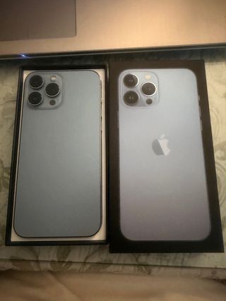 Teléfono móvil iPhone 13 Pro Max en color azul. - Incluye accesorios, como fundas, protectores de pantalla y de camara. - Modelo de alta gama.