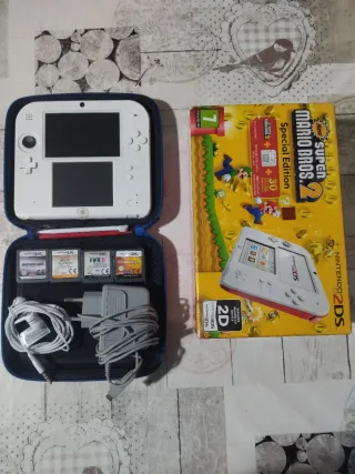 Consola Nintendo 2DS en color blanco, ideal para disfrutar de tus juegos favoritos. - Incluye caja - Incluye funda protectora. - Incluye cargador y auriculares. - Incluye 4 juegos de Nintendo DS: Another Code, Brain Training, FIFA 11 y Project Kub. Leves arañacinos en pantallade arriba,pero es poca cosa son superficiales Tengo más consolas y juegos