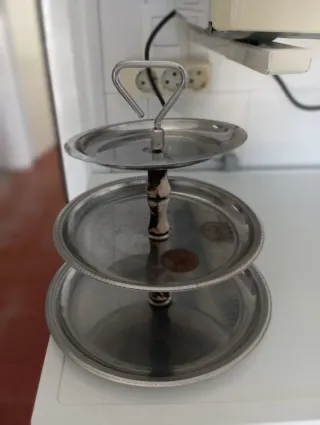 Elegante frutero de alpaca con tres niveles. - Diseño de tres bandejas. - Acabado plateado.