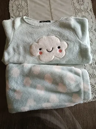 Conjunto de pijama infantil muy suave y calentito, perfecto para las noches frías. - Parte superior de manga larga con estampado de nube sonriente. - Pantalón largo con estampado de lunares blancos y rosas. - Tejido de coralina muy agradable al tacto. - Medidas en fotos