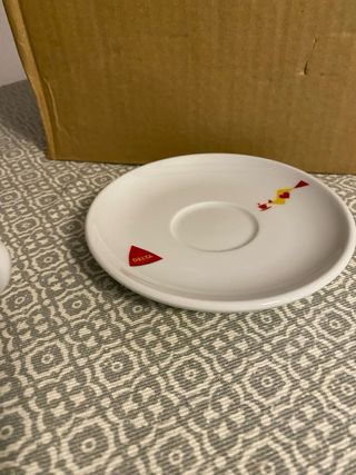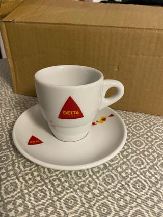 Elegante juego de café de seis tazas con sus respectivos platos. - Diseño clásico en blanco con detalles rojos. - Marca Delta Cafes. - Fabricado en porcelana.