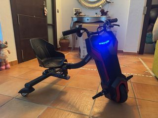 Triciclo eléctrico con un diseño moderno y luces LED azules. - Asiento ergonómico. - Ruedas delanteras giratorias. - Estructura robusta. - Llave de repuesto. - Cargador