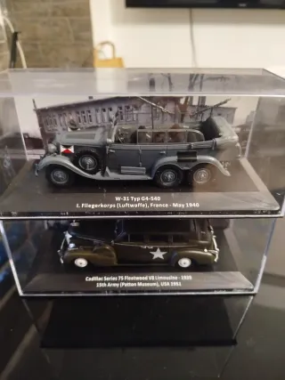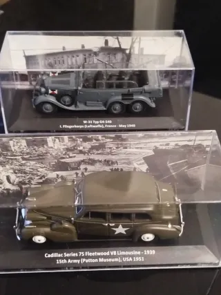 Dos maquetas de vehículos históricos de la Segunda Guerra Mundial. - Maqueta W-31 Typ G4-540, 1. Fliegerkorps (Luftwaffe), Francia - Mayo 1940. - Maqueta Cadillac Series 75 Fleetwood V8 Limousine - 1939, 15th Army (Patton Museum), USA 1951.