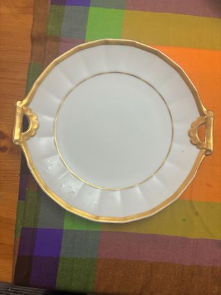 Vajilla antigua de porcelana de Limoges, marca Raynaud & Cie. Porcelana blanca con borde dorado, diseño clásico. Sello original Raynaud – Limoges – France. Buen estado general, sin roturas. Incluye platos, fuente con asas y salsera. Ideal colección o decoración.