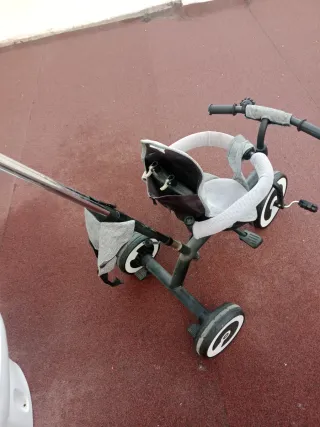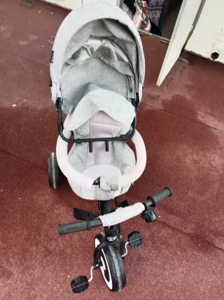 Triciclo infantil con un diseño moderno y funcional. - Estructura de metal resistente. - Asiento acolchado y capota. - Barra de seguridad. - Ruedas duraderas.