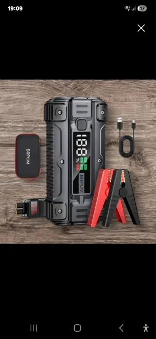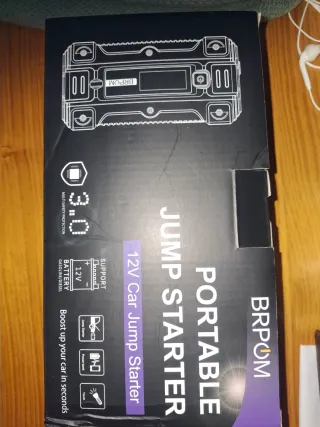 Arrancador de coche Brpom de 6000A. El artículo está nuevo y sin usar. - Incluye cables de pinza. - Incluye cable de carga USB. - Diseño robusto y compacto.