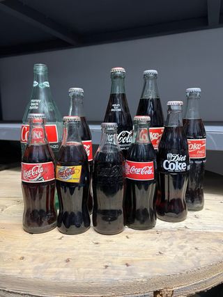 Conjunto de b. antiguas de Coca-Cola y Diet Coke, perfectas para coleccionistas. - B de Coca-Cola con etiqueta Las Vegas. - B de Coca-Cola con etiqueta roja. - B de Coca-Cola con etiqueta amarilla. - B de Diet Coke. - B de Coca-Cola grande money back bottle. - B de Coca-Cola return for deposit.