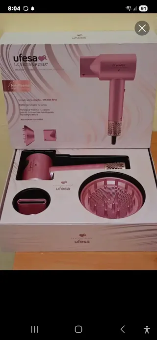Secador de pelo Ufesa, edición especial La Vecina Rubia. Producto nuevo con garantía. - Color rosa metalizado. - Diseño compacto y ergonómico.