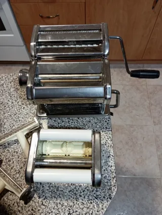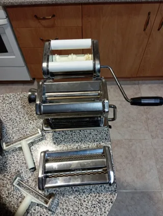 Máquina para hacer pasta. Contiene 2 rodillos, uno regulable en espesor, para amasar, un rodillo para hacer spaghetti, otro para tagliatelle, un accesorio para hacer ravioli, un tornillo de apriete para coger a la mesa, dos rodillos para cortar pasta y una manivela para accionar los rodillos. - Fabricada en metal y plástico. - Color plateado y blanco. - Se ha usado una vez.