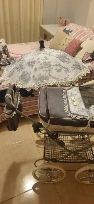 Conjunto de carro de muñeca rebor con varios accesorios y muñeca incluida . - Saquito con borreguito - Carro de muñeca de estilo clásico. - Incluye sombrilla y bolsos - Cesta inferior para accesorios. - Adornos de encaje blanco. No se hacen envios se recoge en persona