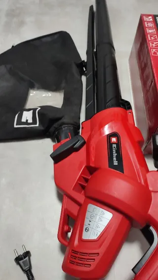 Soplador y aspirador de hojas Einhell, modelo 2023. Incluye bolsa de recolección. - Color rojo y negro. - Correa para colgar. - Cable de alimentación.