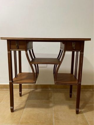 Elegante mesa recibidor de caoba. - Patas con detalles decorativos. - Dos cajones superiores. - Estantes inferiores para almacenamiento adicional. - Acabado en madera oscura.