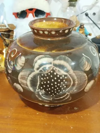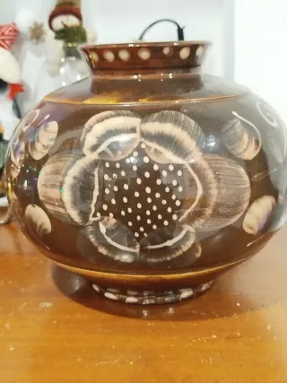 Jarrón de cerámica marrón con diseño floral
