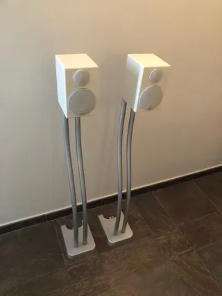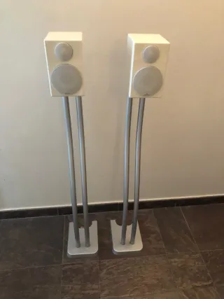 Altavoces de la marca Monitor Audio, modelo Radius 90, con sus soportes metálicos. - Diseño elegante y compacto. - Soportes metálicos plateados. - Marca monitor audio