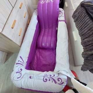 Piscina inflable morado. en su caja , nuevo. - Tonos morados y blancos. Fabricada en plástico resistente. Incluye - Tapa con cierre de velcro y correas con evilla para spa. - Colchoneta inflable con respadar y cebecero