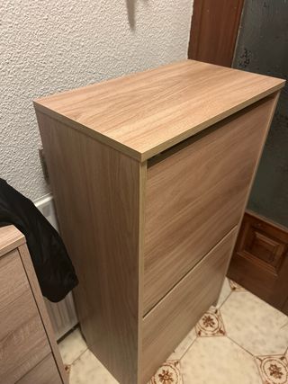 Mueble zapatero de Ikea con acabado en madera. - Diseño de dos niveles. - Color madera natural.