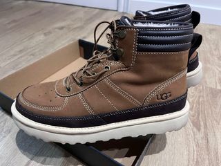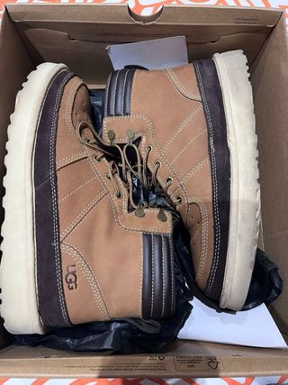 Botas UGG modelo Highland Sport en color marrón. - Diseño tipo sneaker de caña alta. - Cierre con cordones. - Detalle de costuras blancas. - Forro interior de pelo. Apenas usadas y en muy buen estado. Exterior de piel/ante y forro interior de pelo, muy cálidas y cómodas. Suela deportiva en perfecto estado. Listas para usar. Ideal para el invierno