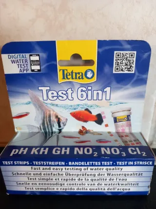 Kit de análisis de agua Tetra Test 6in1 para acuarios. Permite un test rápido y sencillo de la calidad del agua. - Mide pH, KH, GH, NO₂, NO₃ y Cl₂. - Incluye tiras reactivas. - Digital Water Test App compatible.