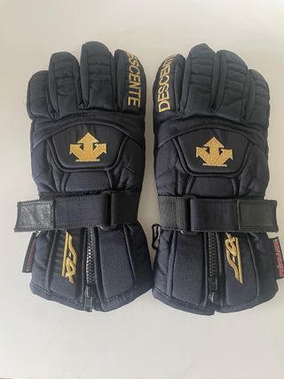 Guantes de esquí Descente en color negro con el logo en dorado, cierre velcro y cremallera, estilo vintage, talla S, primaloft, piel, tienen algún rasguño debido al uso, “ ver en las fotos”, vendo por no usar