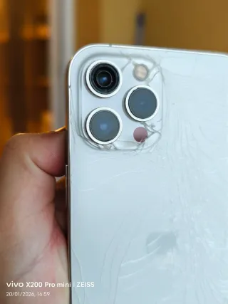 Teléfono móvil iPhone 12 Pro Max en color plata. Presenta un diseño elegante y moderno. Incluye la caja Cristal de la Camara 2.5× está roto y vibra un poco cuando lo uso y a veces falla el focos La pantalla está rota pero funciona correctamente Face id funciona Los altavoces funcionan Micrófonos funcionan - Pantalla de 6.7 pulgadas. - Sistema de triple cámara trasera. - Acabado en cristal y acero inoxidable.