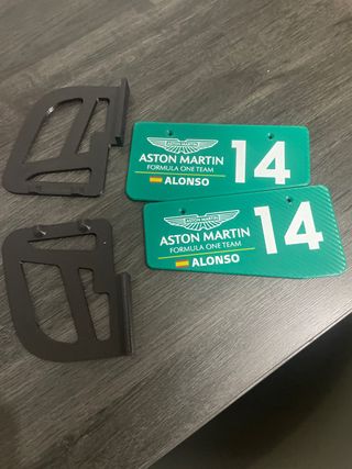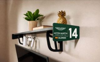 Set de dos soportes y dos placas decorativas del equipo Aston Martin de Fórmula 1, con el número 14 y el nombre de Fernando Alonso. Balda incluida (120x20x1,9cm)