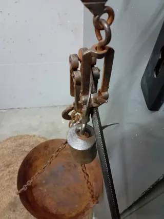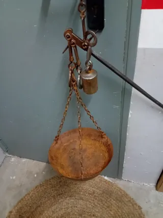 Balanza antigua de tipo romana, ideal para coleccionistas o decoración. - Construcción robusta de metal. - Plato de pesaje circular. - Mecanismo de contrapeso visible.Escucho ofertas. Solo venta en persona.