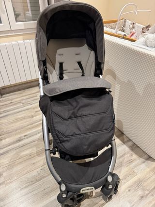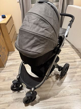 Carro de bebé en tonos grises y negros, con un diseño moderno y funcional. - Capota amplia para proteger del sol. - Asiento acolchado para mayor comodidad. - Arnés de seguridad de 5 puntos. - Reposapiés ajustable. - Ruedas todoterreno.