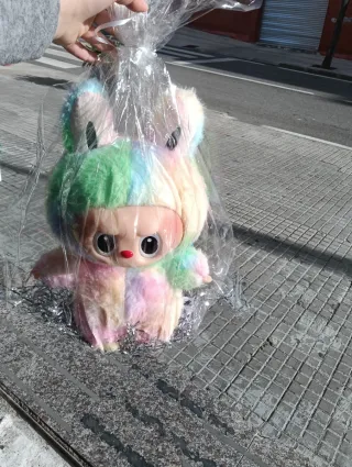 Adorable peluche Labubu con un diseño de arcoíris. - Colores vibrantes: verde, rosa, amarillo y blanco. - Material suave y esponjoso. - Cara detallada con ojos grandes y nariz roja.