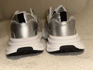 Zapatillas deportivas con un diseño moderno y llamativo. - Combinación de colores plateado y blanco. - Materiales textiles y sintéticos. Probé usarlo, pero me quedó pequeño. Lo vendo por 30€ prácticamente nuevo. Talla 37 (aprox. para 12 años). La plantilla mide 24 cm, recomendado para pie de 23 cm.