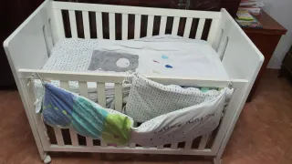 Cuna de bebé en color blanco, con un diseño moderno y funcional. Perfecta para el descanso del bebé. - Estructura de madera lacada en blanco. - Laterales con barrotes y ranuras decorativas. - Ruedas para facilitar su movilidad.