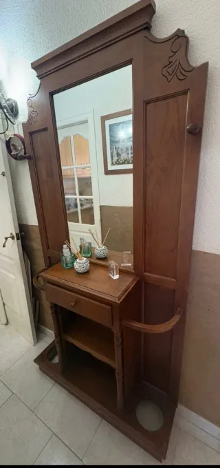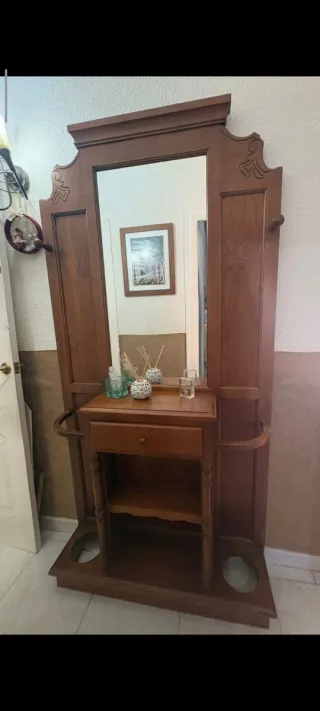 Mueble recibidor de madera con espejo y cajón. - Diseño clásico y elegante. - Incluye espejo. - Cajón central. - Estantes inferiores. - Aros para sombrillas o bastones.