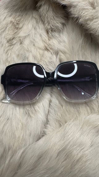 Gafas de sol Guess con un diseño moderno y elegante. El color negro se degrada suavemente hacia un tono transparente en la parte inferior. - Montura de acetato. - Lentes con protección UV. - Logo de la marca en las patillas con brillantes