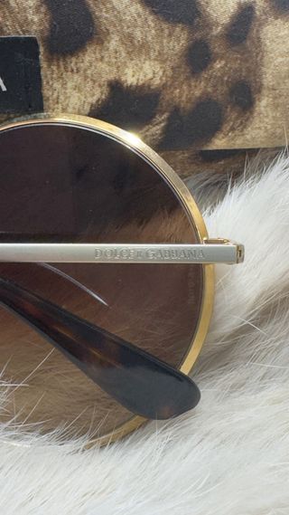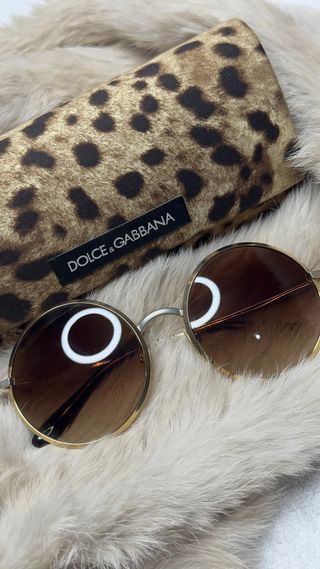 Elegantes gafas de sol Dolce & Gabbana con montura redonda y detalles dorados. - Lentes con degradado marrón. - Montura metálica dorada. - Incluye funda con estampado de leopardo. La única rayita que tiene se aprecia en la última foto. No se han usado, la raya ha sido al limpiarlas. Pero prefiero avisarlo por si pasa desapercibido.