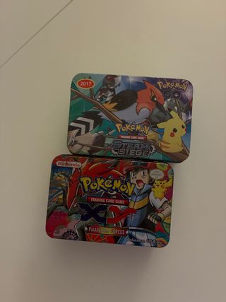 Dos latas coleccionables de cartas Pokémon. - Lata Pokémon TCG: Steam Siege (2017). - Lata Pokémon TCG: XY Phantom Forces.