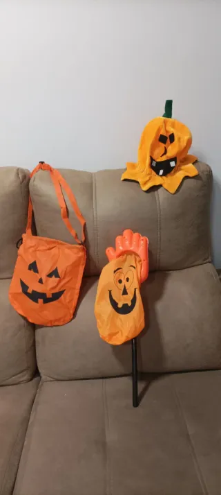 Conjunto de tres artículos temáticos de Halloween. - Gorro con diseño de calabaza. - Talega naranja con cara de calabaza. - Mano con red para chuches.