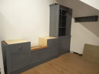 Conjunto de mesa de comedor de madera con seis sillas a juego. Solo habría que encolar las sillas y un poco la mesa. Ideal también si se tapizan los asientos - Mesa de madera. - Seis sillas de madera con asiento azul.