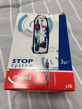 Set de compás Maped con sistema STOP. 8 unidades completamente nuevo - Incluye 3 piezas. - Diseño en rojo y azul. - Marca Maped.