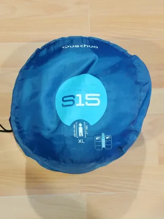 Saco de dormir Quechua modelo S15 en talla XL. Color azul. Es transformable en edredón y adaptable a otro saco de dormir idéntico para dormir dos personas. Temperatura confort 15ºC. - Diseñado para personas de hasta 200 cm de altura. - Incluye bolsa de transporte.