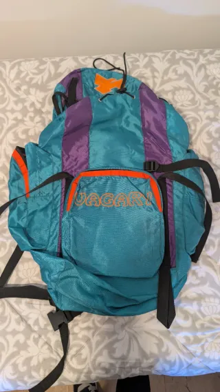 Mochila de montaña de la marca Vagary. - Diseño con paneles en color turquesa y morado. - Bolsillo frontal con el logo de la marca en color naranja. - Cierre superior con cordón ajustable. - Tiras de sujeción negras.