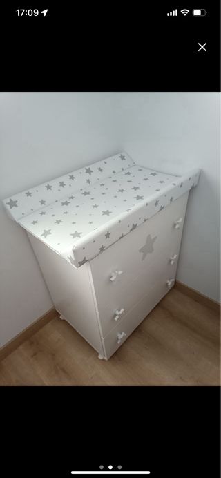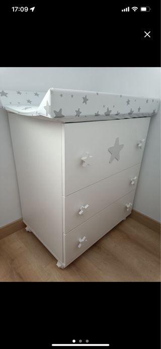 Cambiador para bebé con bañera integrada. Ideal para el cuidado diario del recién nacido. - Estructura blanca. - Diseño con estrellas grises en el cambiador. - Patas con ruedas para fácil movilidad.