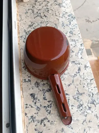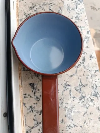 Cazo vintage de esmalte con interior azul y borde marrón. Ideal para coleccionistas o decoración. - Interior de color azul claro. - Borde exterior de color marrón rojizo. - Mango largo de color marrón rojizo.